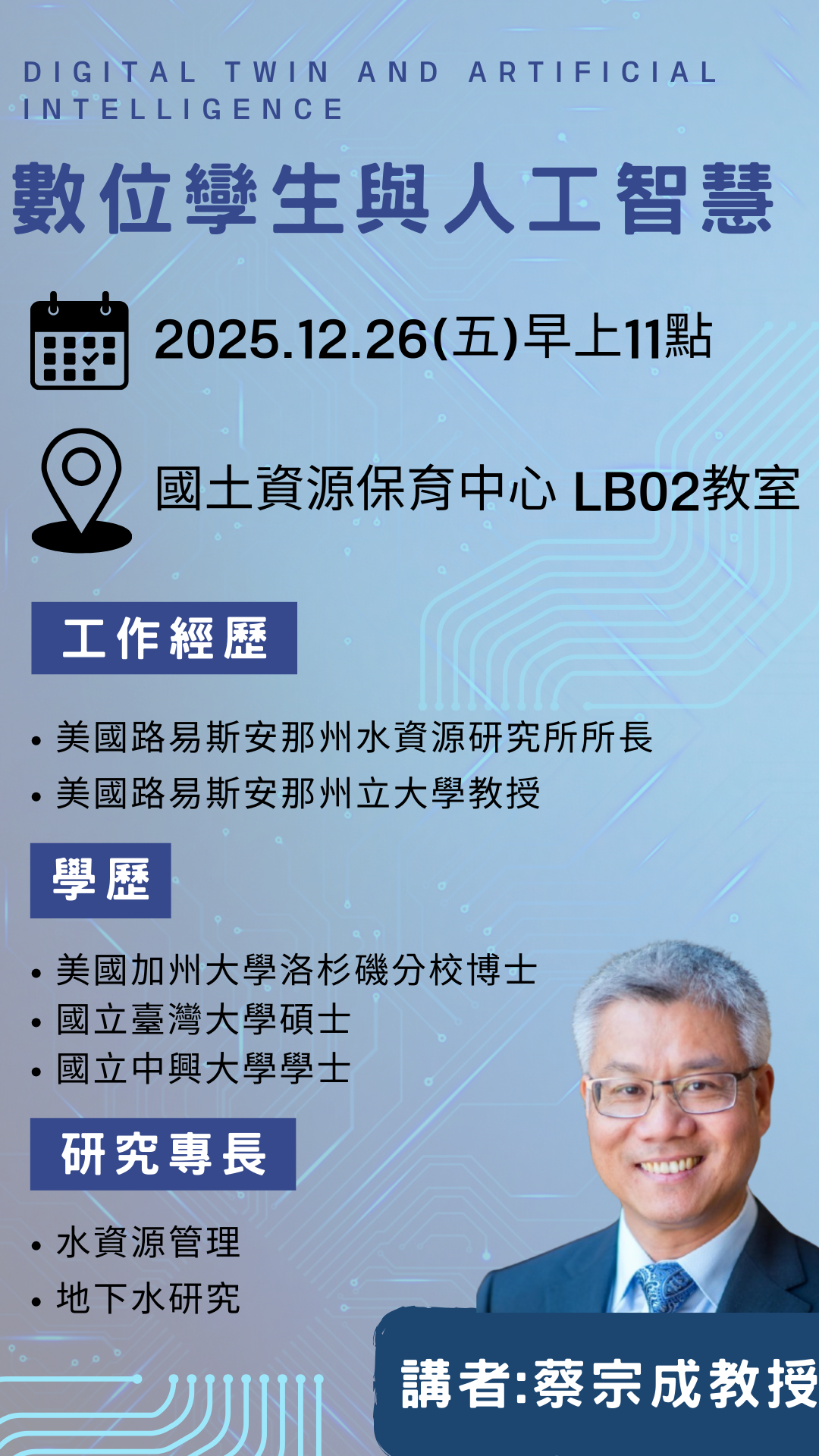 114/12/26(五)專題演講:數位孿生與人工智慧 講者:蔡宗成教授